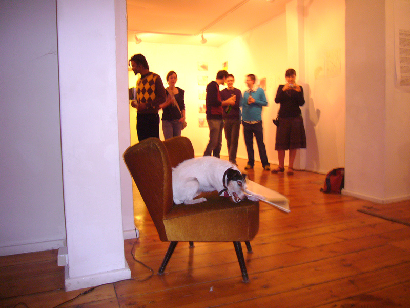 As a dog, Tillamook Cheddar faces a great many boundaries that human artists do not. To name a few, she is barred from entering most museums; it is unlikely that she will ever be accepted to art school; a great many humans refuse to take her seriously merely because of her species. Another boundary of sorts-her leash and all that it suggests-binds her to me. While I believe that Tillie is an artist in her own right, I realize that we are a collaborative team that, in the creation of art, often functions as a single entity.